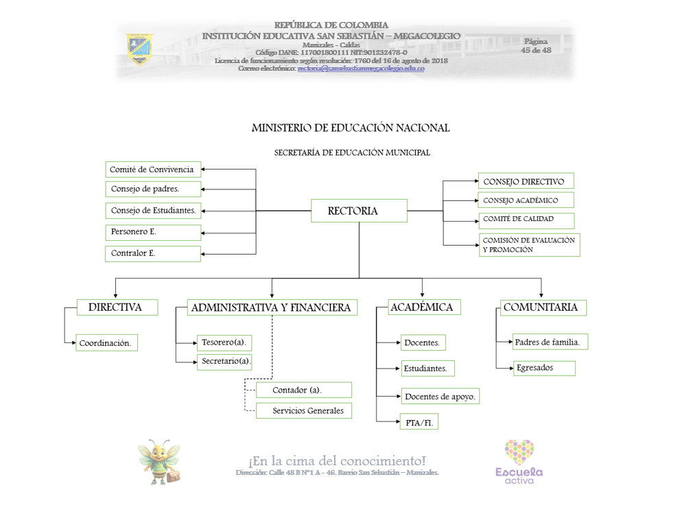 La Institución Educativa San Sebastián – Megacolegio cuenta con una estructura organizacional clara que articula la rectoría con los diferentes consejos, comités y órganos de participación, garantizando transparencia, calidad y acompañamiento en todos los procesos. En este esquema se integran instancias como el Consejo Directivo, el Consejo Académico, el Comité de Convivencia y los representantes estudiantiles, fortaleciendo la democracia escolar y la participación de toda la comunidad educativa.